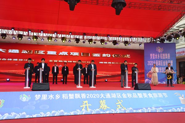 在10月18日舉行的“夢里水鄉(xiāng) 稻蟹飄香”2020大通湖區(qū)金秋品蟹美食旅游節(jié)開幕式上,董事長郭躍明(右二)代表公司與大通湖區(qū)委區(qū)政府現(xiàn)場簽約,開啟了大通湖區(qū)“湘情湘韻”智慧田園綜合體項目開發(fā)的序幕。
