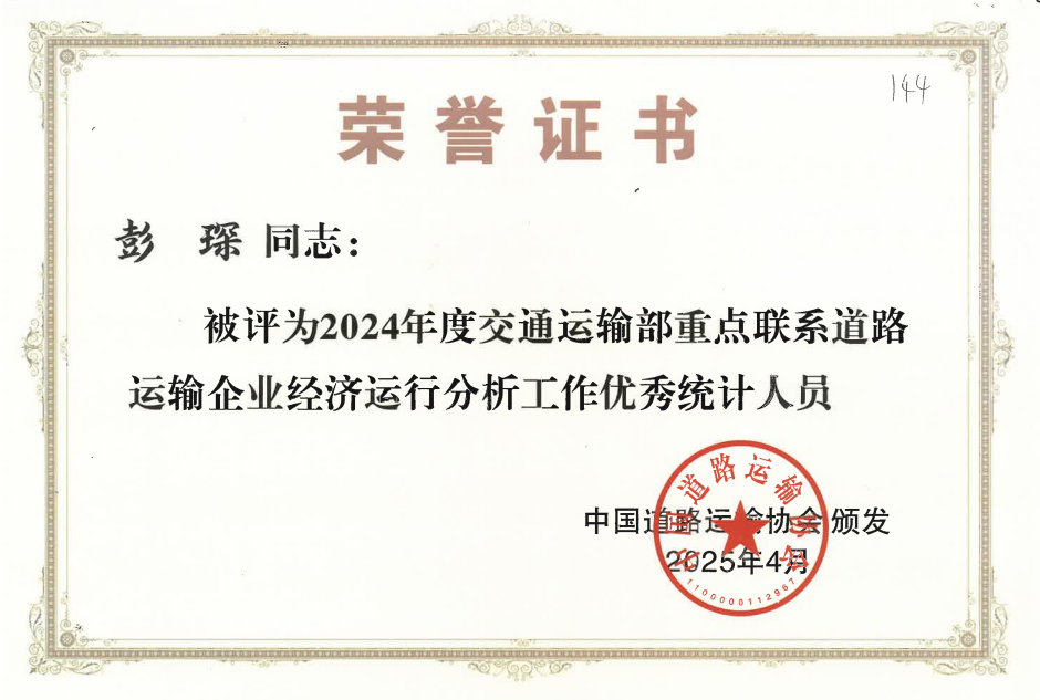 此次會議和表彰工作由中國道路運輸協(xié)會組織。同時榮獲“優(yōu)秀統(tǒng)計人員”的還有益陽湘運集團股份有限公司客戶服務部彭琛。會議共表彰來自全國各地的先進單位102家、優(yōu)秀個人117名。 (彭琛 鄧玉姬)