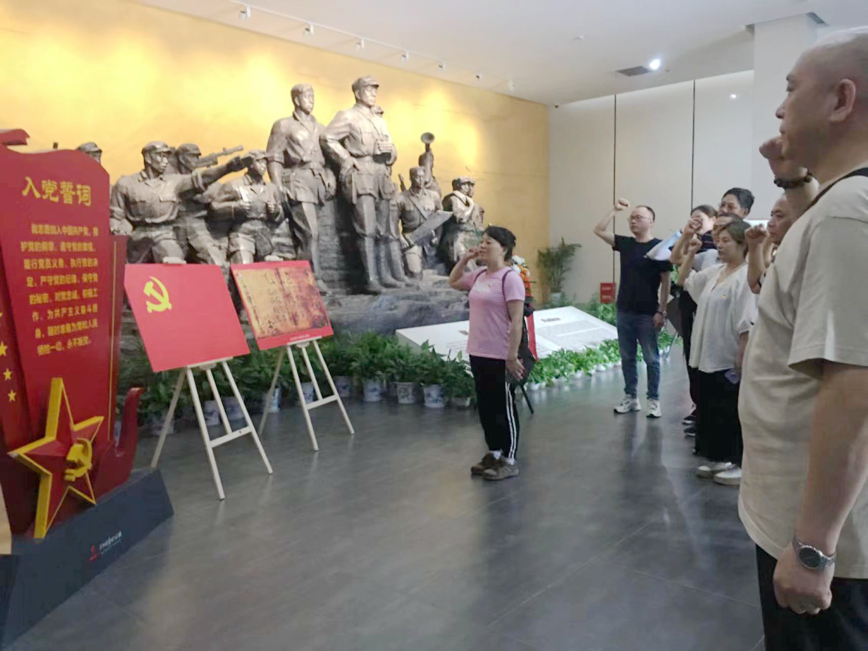 在平江起義紀(jì)念館,37名同志跟隨講解員,邊聽(tīng)邊看。通過(guò)精彩的講解和史料陳列館內(nèi)的實(shí)物、照片,在凝重肅穆的氣氛中,大家重溫了湖南農(nóng)民運(yùn)動(dòng)那段熱血沸騰的歷史,追憶了在中國(guó)共產(chǎn)黨領(lǐng)導(dǎo)下開(kāi)辟湘鄂贛革命根據(jù)地的艱難歷程,深刻體會(huì)到了共產(chǎn)黨人不怕?tīng)奚?、不屈不撓的革命斗?zhēng)精神。在館內(nèi),大家還一起重溫了入黨誓詞。
